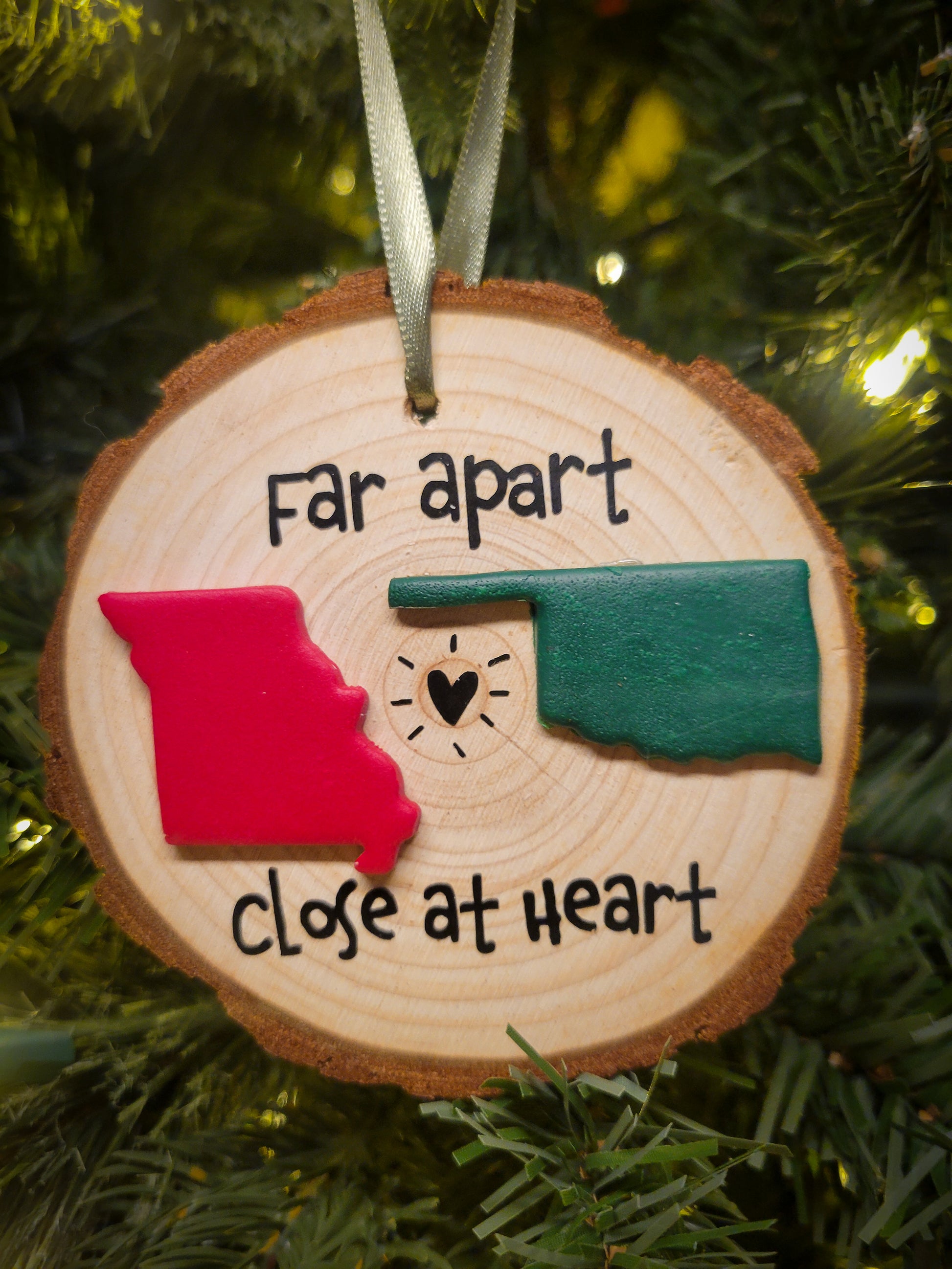 A handmade polymer-clay state-to-state ornament on a natural wood slice. Each ornament features two states of your choice, connected by a tiny heart in the center with the phrase “Far apart, close at heart.” The states are sculpted from polymer clay not vinyl or printed graphics, so the colors and textures have a soft, dimensional feel.