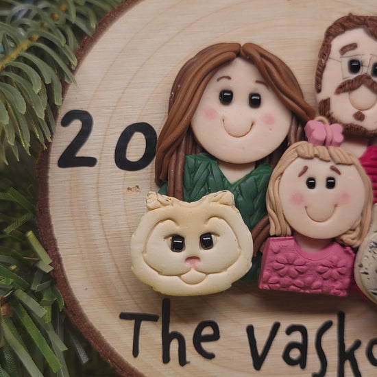 The base ornament includes up to 2 figures (2 people) and the year (2025). Customize with up to 6 figures, 4 pets, 2 props & custom text! There is additional charge for more people/pets, as well as additional personalized writing or props such as a volleyball, etc. Each ornament is between 3.5 to 5 inches (depending on variation of wood slices).
